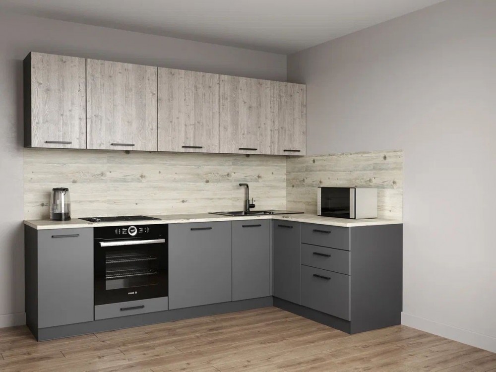 Кухонный гарнитур Антик 2600*1600 (Стол. 38мм) Верх Корпус: Антрацит Верх Фасад: Ель Антик (№3871) МДФ Низ Корпус: Антрацит Низ Фасад: Берлин (№962) МДФ Столешница: Сосна Осло Описание: Корпус ЛДСП 16 мм, кромка ПВХ 0,4 мм. Фасады ЛДСП 16 мм, кромка ПВХ 1мм. Фасады МДФ 16 мм Фасады верхних модулей со свесом 12 мм дают возможность использовать без установки ручек. Петли с доводчиком. Навесы внутренние, регулируемые, с декоративной крышкой. Направляющие шариковые полного, плавного выдвижения с нагрузкой до 30 кг. Столешницы цельные с пластиковым покрытием со скруглением по переднему краю (постформинг толщина 38 мм). Регулируемые ножки-опоры.